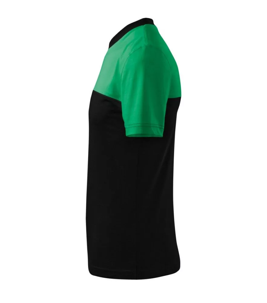 Kereknyakú unisex póló. Kétszínű tervezésű, oldalvarrással és vízszintes elválasztással. 1:1 bordás kötésű nyakszegély 5% elasztánnal. A váll vállszalaggal megerősített. 100% pamut anyagból készült, 40°C mosható.